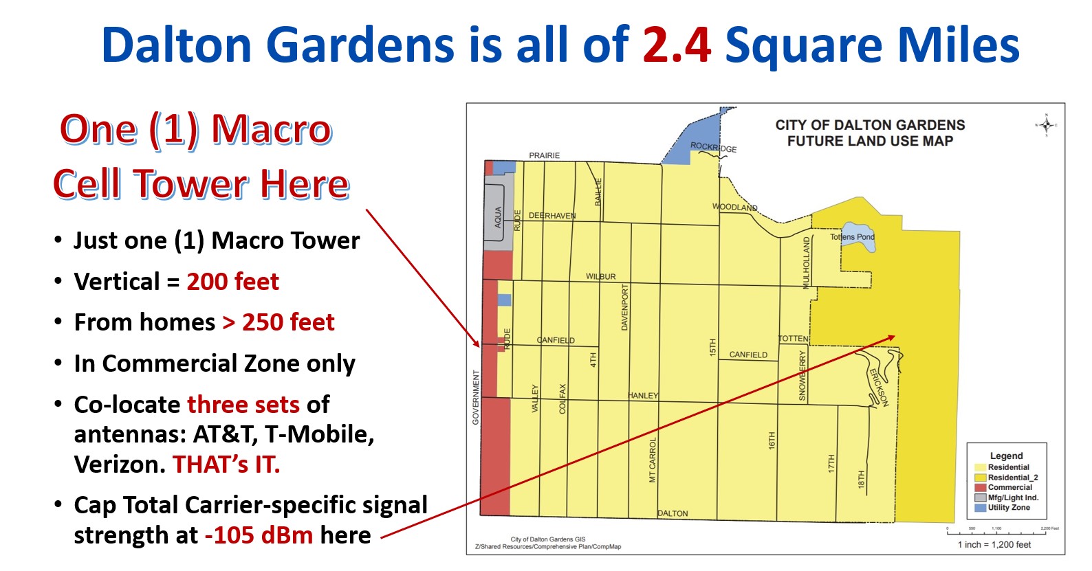 We discussed the impacts of this ordinance and looked for another way to balance the convenience and benefits of personal WTFs and the rights of the Dalton Gardens community, and after 1.5 years of negotiating with the City, Attorney Andrew Campanelli was hired to write the Dalton Gardens Model Ordinance.